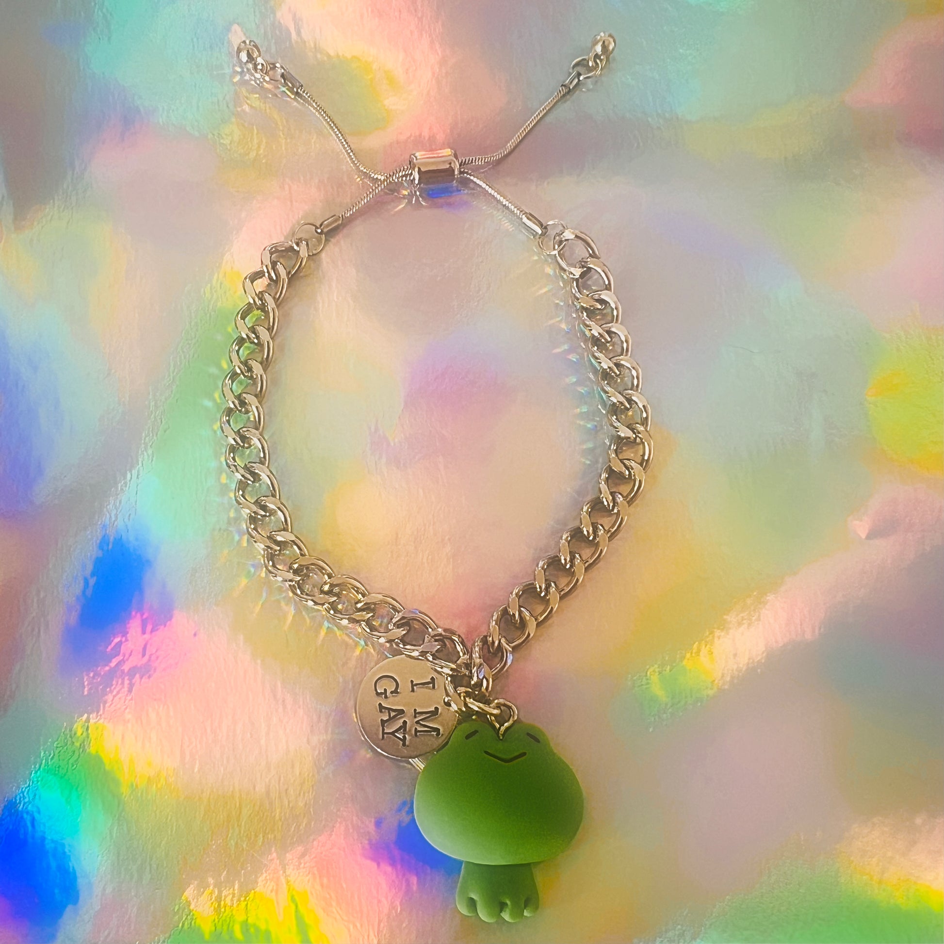 An adjustable bracelet with a little green gay frog, his metal tag says “IM GAY”